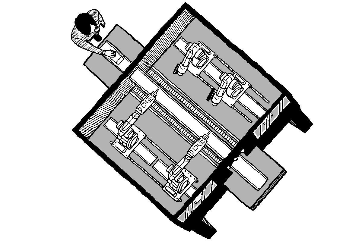 装置内部には、2台1組のロボットアームが2セット。1台が製品を掴んで回転させ、向かいの1台が照明を照射しながらカメラで検査を行います。